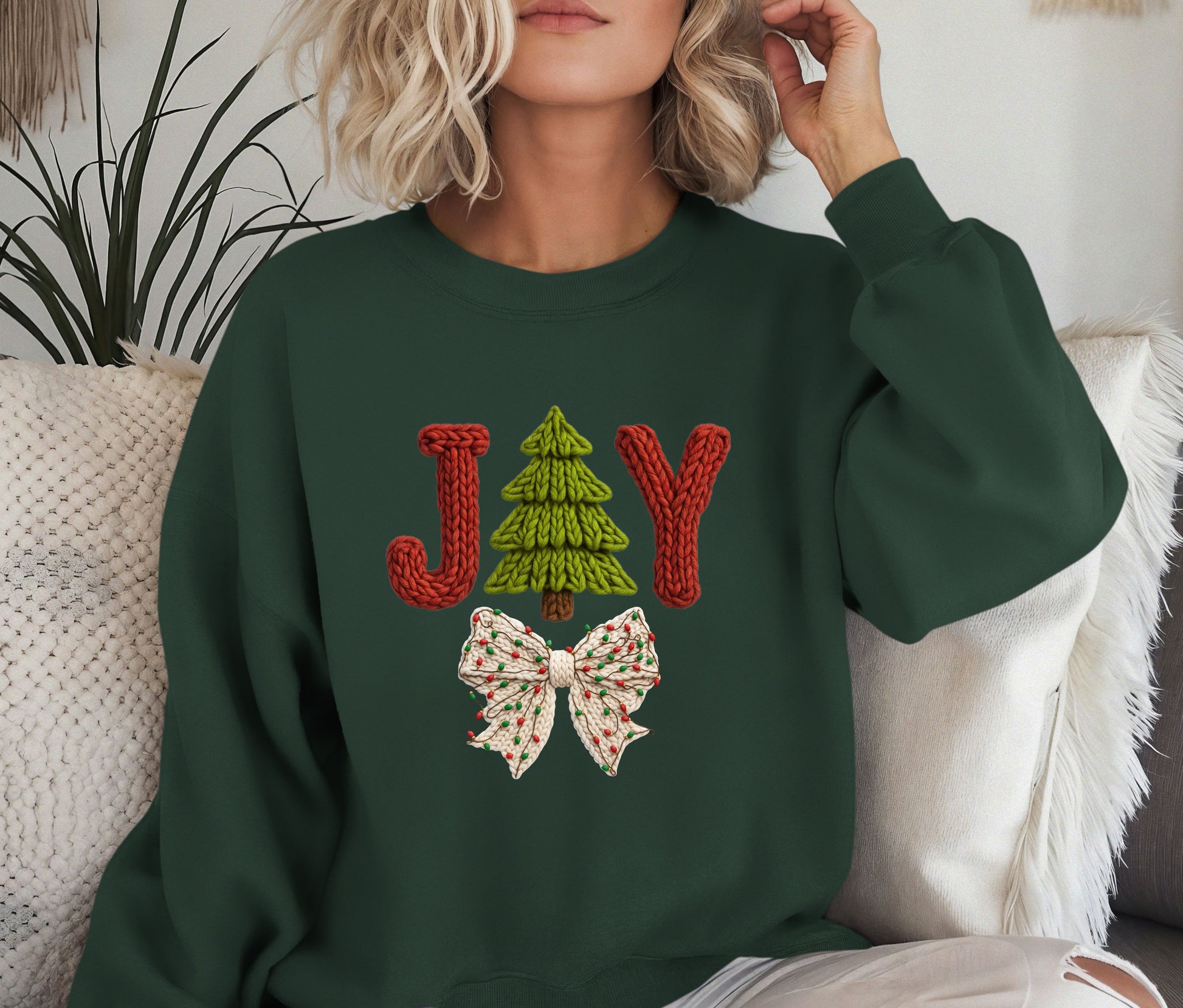 Spread holiday cheer with this adorable JOY Christmas sweatshirt! Featuring a festive knitted-style design with a bow, Christmas tree, and textured lettering, this cozy crewneck brings warmth, comfort, and Christmas charm to your winter wardrobe.