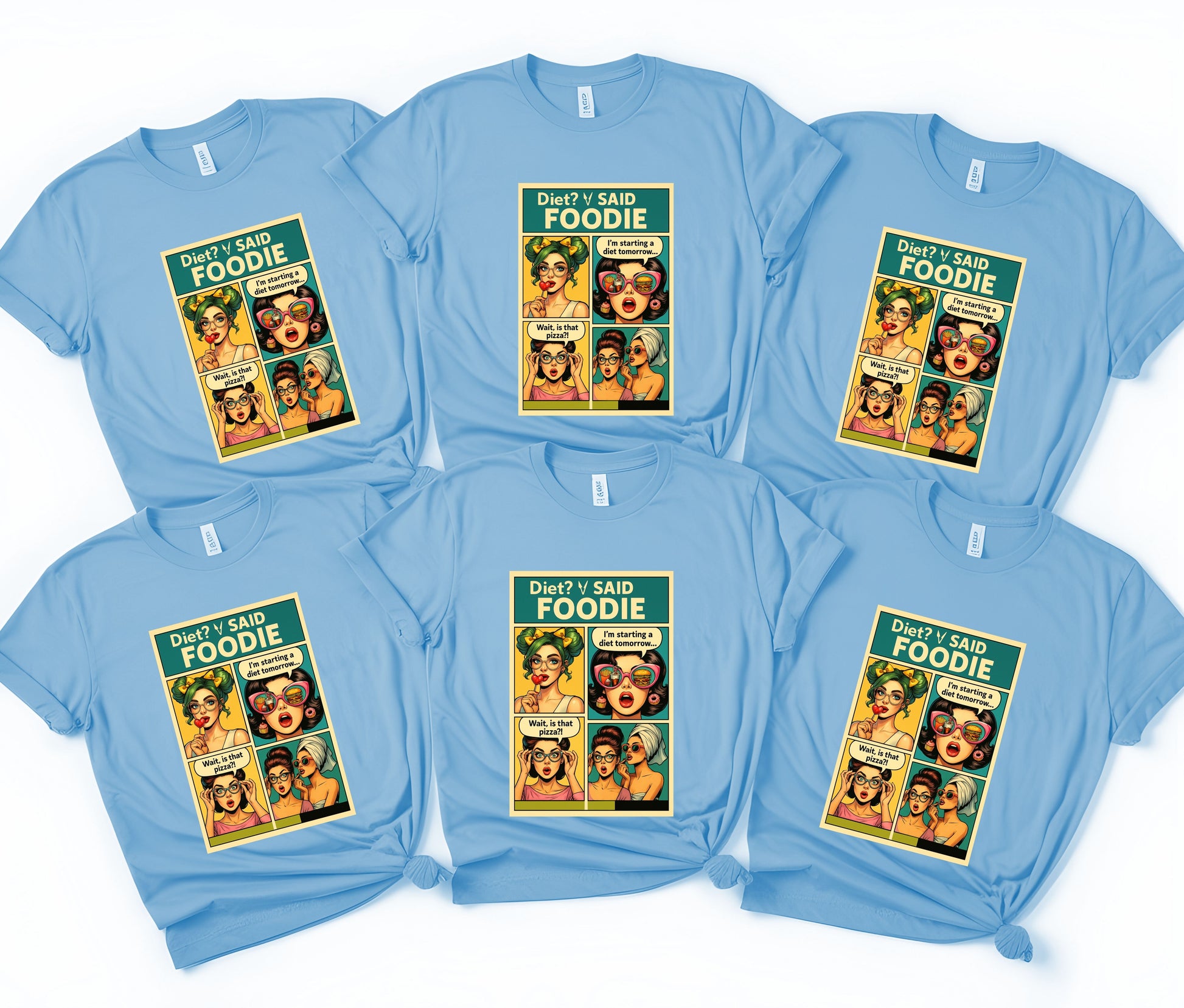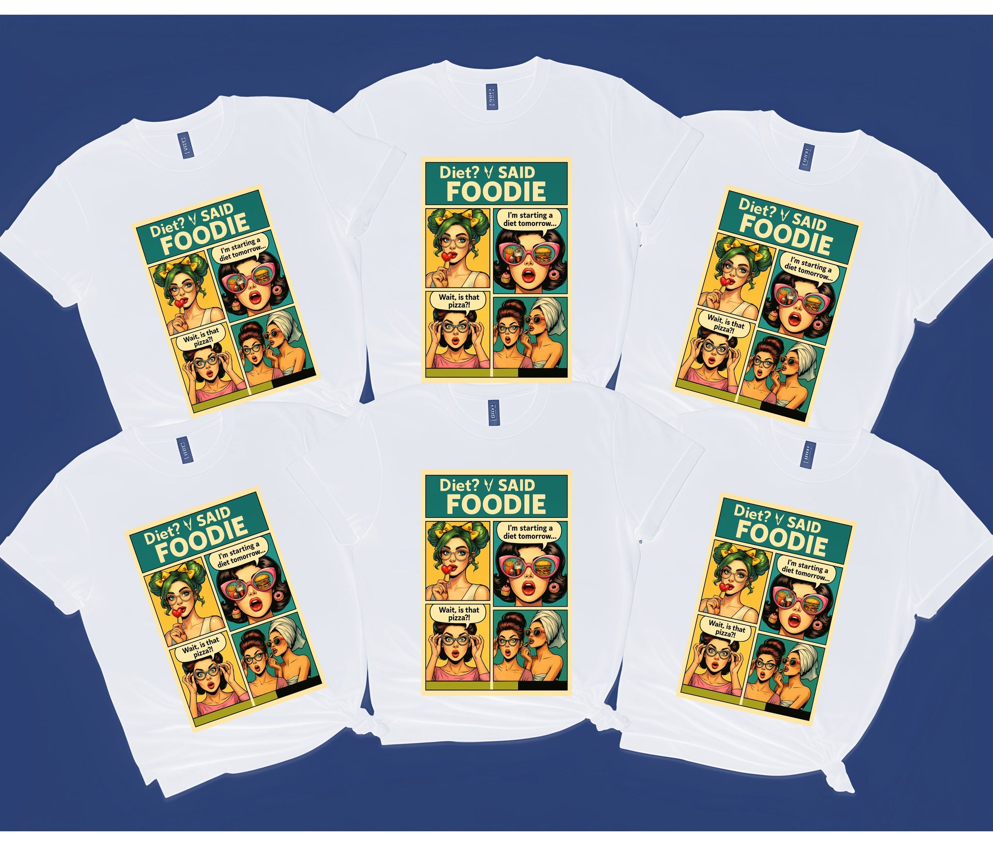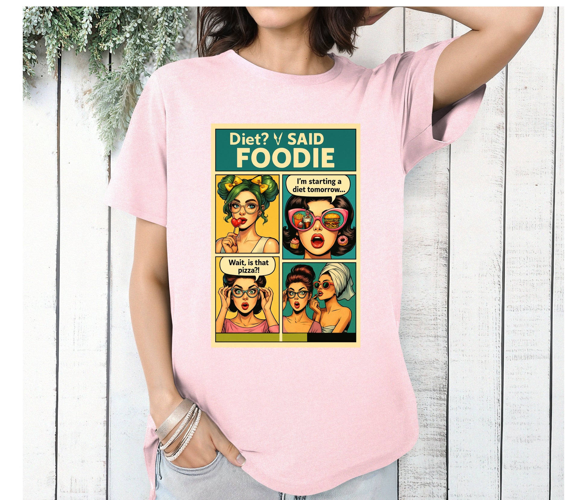 Turn your love for food into a fashion statement with our “Diet? I Said Foodie” comic-style graphic tee! 🍕🍔 This retro pop-art inspired shirt is perfect for anyone who’s ever said they’ll start a diet tomorrow… but couldn’t resist pizza today!