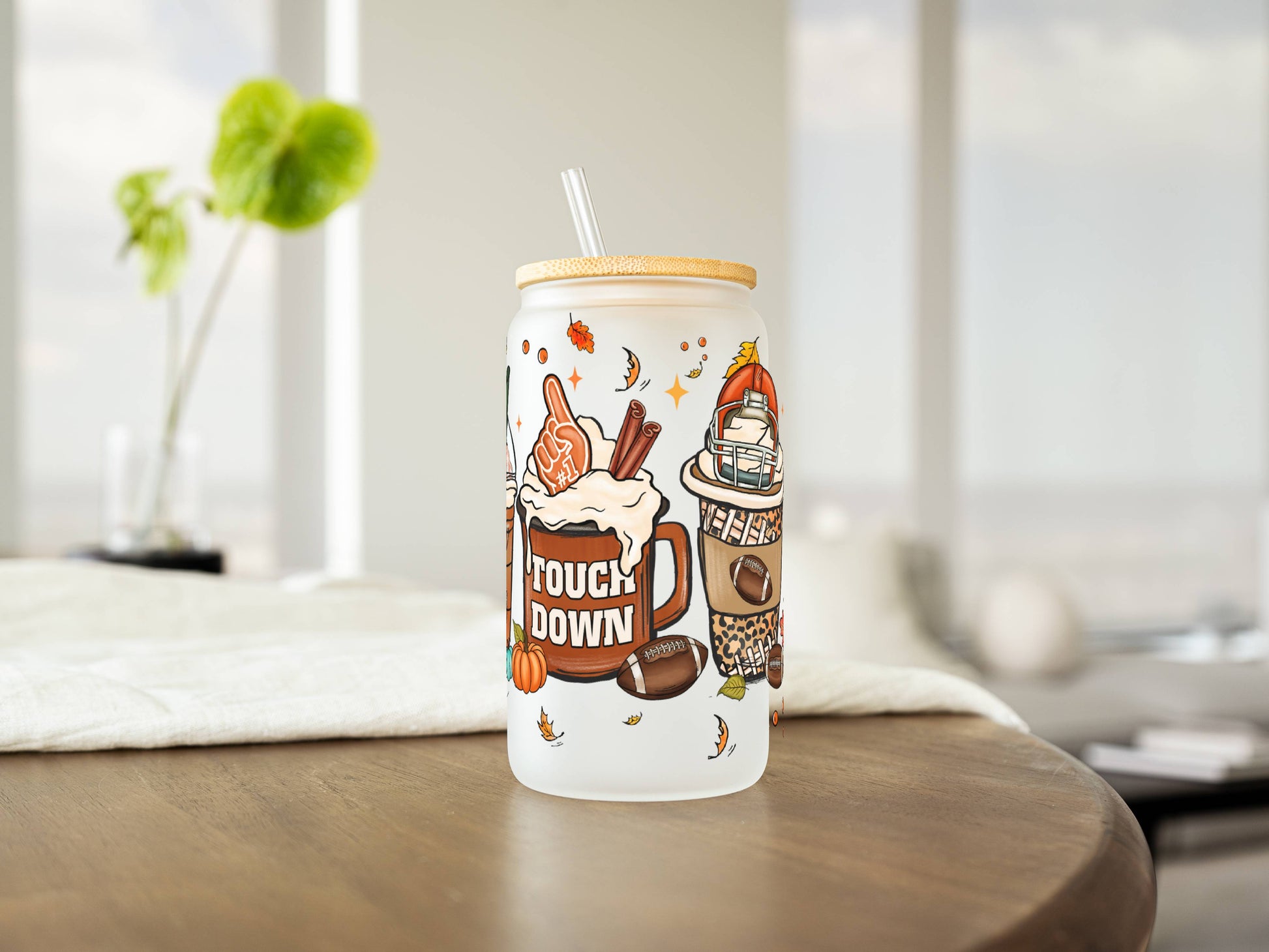 Touch Down 16oz Glass Tumbler – Frosted | Reusable Iced Coffee Cup with Bamboo Lid & Plastic Straw | Aesthetic Cold Drink Cup
