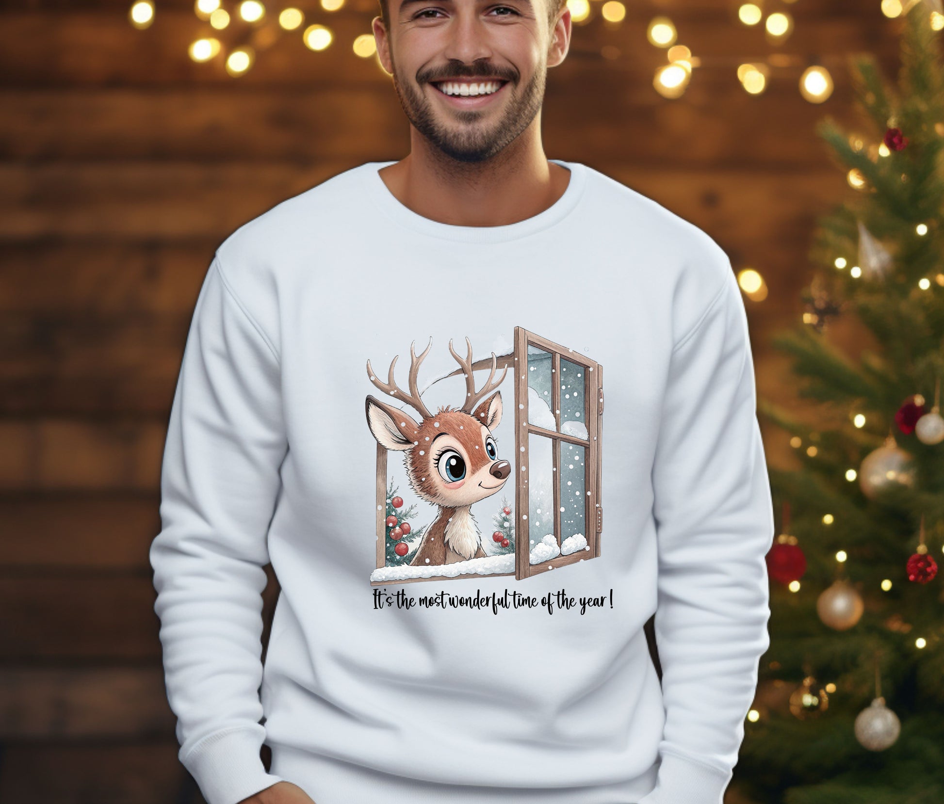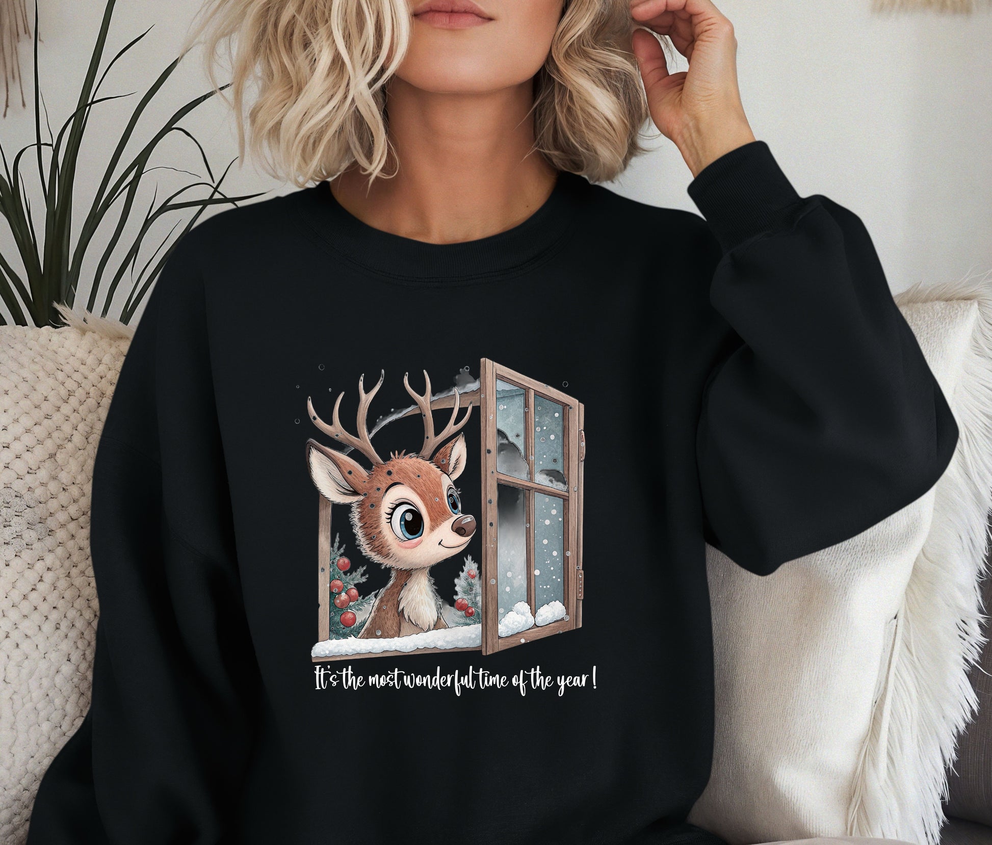 Bring on the holiday cheer with this adorable reindeer Christmas sweatshirt! Featuring a sweet reindeer peeking out of a frosty window and the phrase βItβs the most wonderful time of the year!β, this cozy crewneck is perfect for all your festive moments β decorating, baking cookies, or watching your favorite Christmas movies.