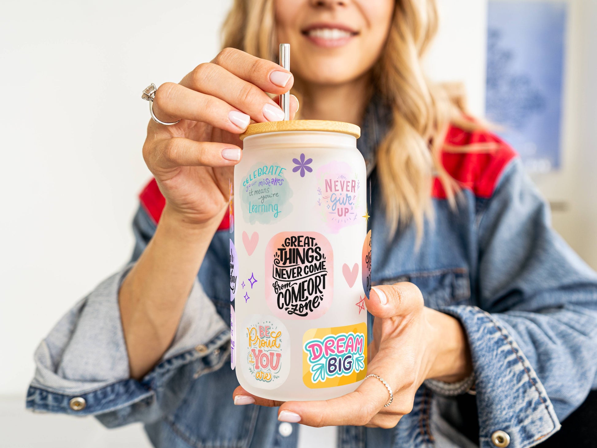 Affirmation 16oz Glass Tumbler – Frosted | Reusable Iced Coffee Cup with Bamboo Lid & Plastic Straw | Aesthetic Cold Drink Cup